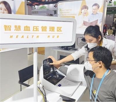 进博会技术装备展区,观众在工作人员的指导下测量血压。
