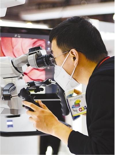 进博会技术装备展区,观众在体验蔡司集团展示的手术显微镜。