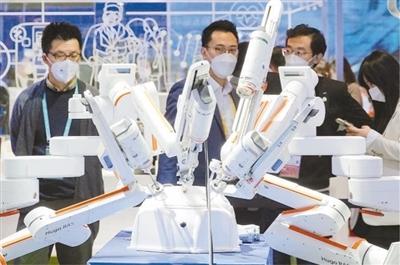 观众在进博会美敦力展位了解机器人辅助手术系统。