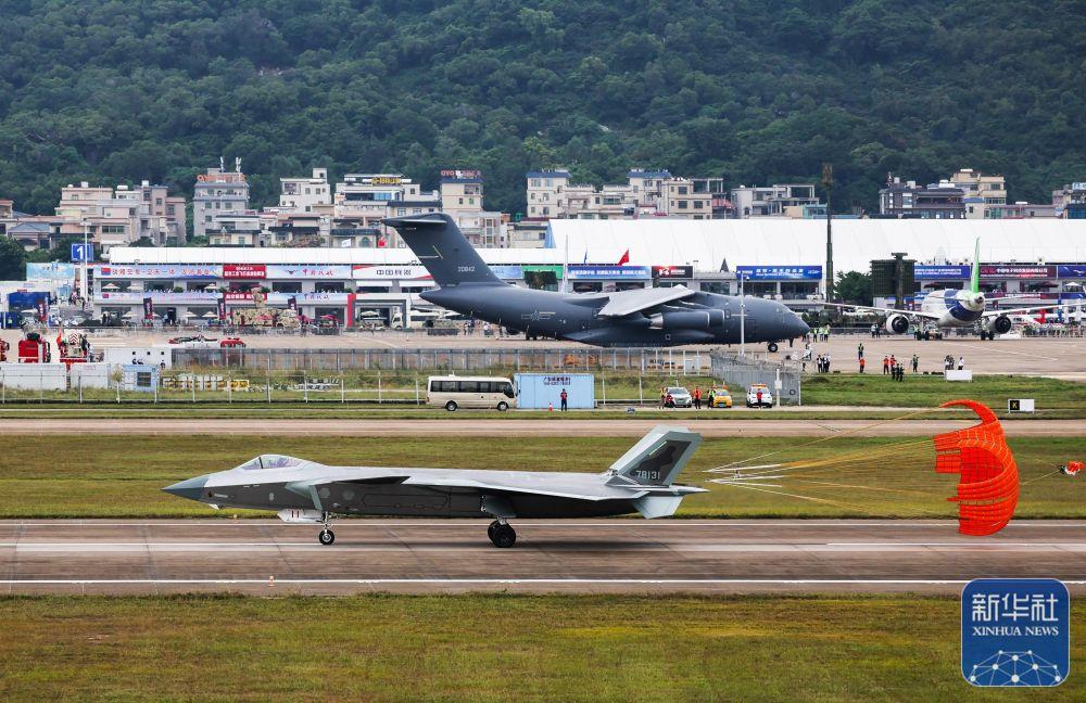 在第十四届中国航展上,歼-20(前)降落珠海机场后从运油-20前滑过(11月8日摄)。新华社记者 刘大伟 摄