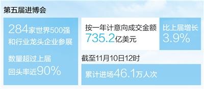 展商展品质量更优。284家世界500强和行业龙头参加企业展、数量超过上届、回头率近90%……本届进博会展台特装比例达到96.1%,高于上届水平。