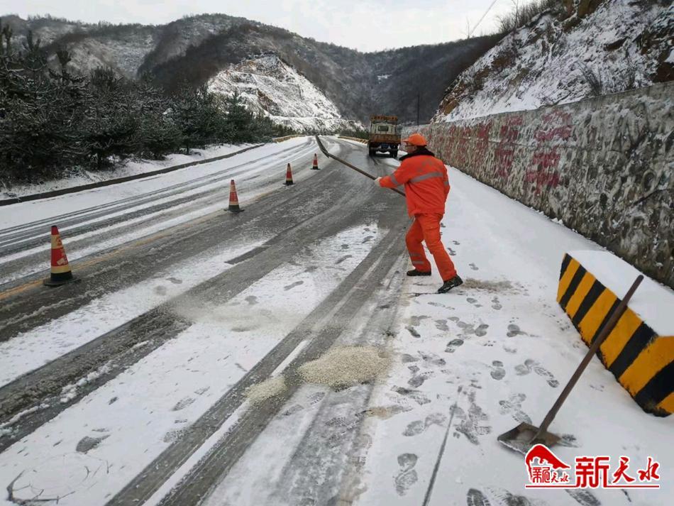 武山公路段“以雪为令”积极开展除雪保畅作业,重点对洛礼路界牌山隧道附近背阴、弯道等积雪较多路段,撒布融雪剂、防滑料,并清除路面积雪,确保道路安全畅通,为人民群众安全出行保驾护航。