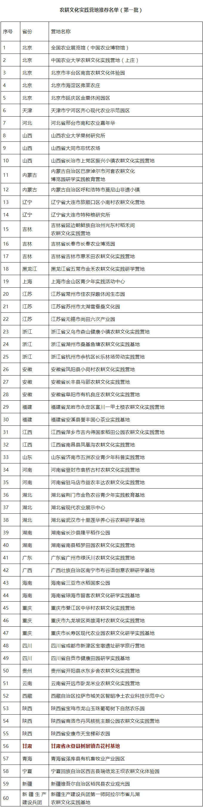 日前,农业农村部、共青团中央、全国少工委组织开展了农耕文化实践营地推荐工作。经过逐级推荐、材料审查、专家评审和网上公示,全国农业展览馆(中国农业博物馆)等60个单位为农耕文化实践营地,甘肃省永登县树屏镇杏花村基地入选。