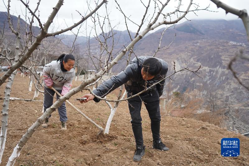 图为郭河乡营寨村村民杨利红和妻子在田间管护花椒树。(资料图片)