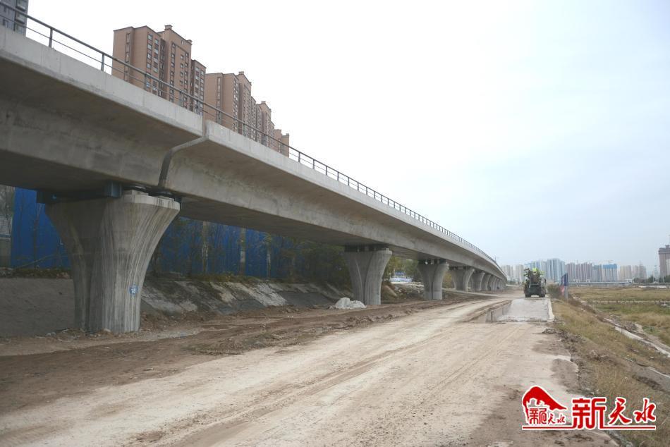 11月14日,记者在秦州区瀛池大桥西侧的南沟河特大桥施工现场看到,在20个桥墩、2个桥台的支撑下,全长590米的大桥沿着藉河南岸延伸至南沟河。登上大桥,桥梁两侧的护栏已经安装完毕,目前正在进行桥面附属工程施工。
