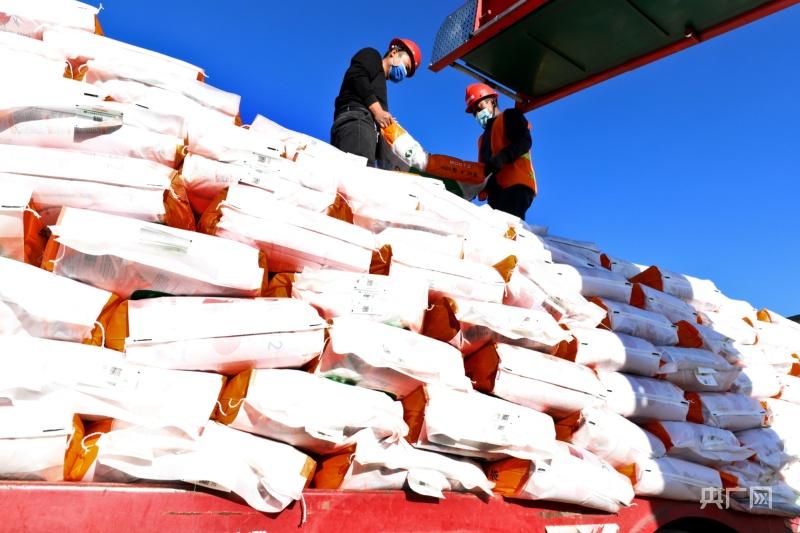 工作人员将加工好的玉米良种装车(央广网发 王将 摄)