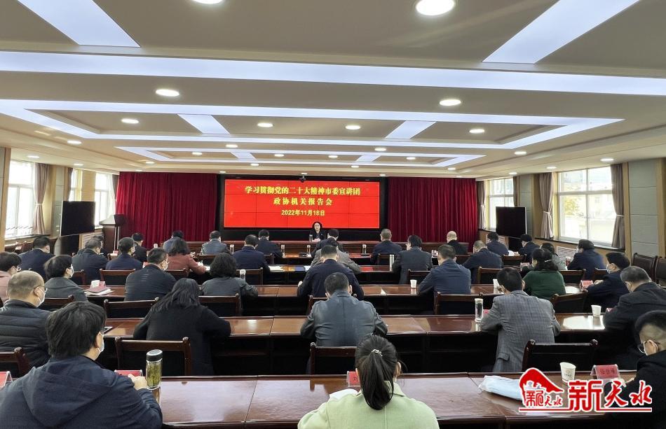 新天水讯【记者马哲】11月18日下午,学习贯彻党的二十大精神市委宣讲团宣讲报告会在市政协机关举行,市政协党组书记、主席王燕作宣讲报告。市政协党组副书记、副主席郭明兴,副主席马勤学、马筱宁、吴立新、董仲奇、崔玉军、罗增芳、范多智,党组成员、秘书长董小明,党组成员、经济委主任贾忠慧和机关全体干部职工现场聆听了辅导报告。