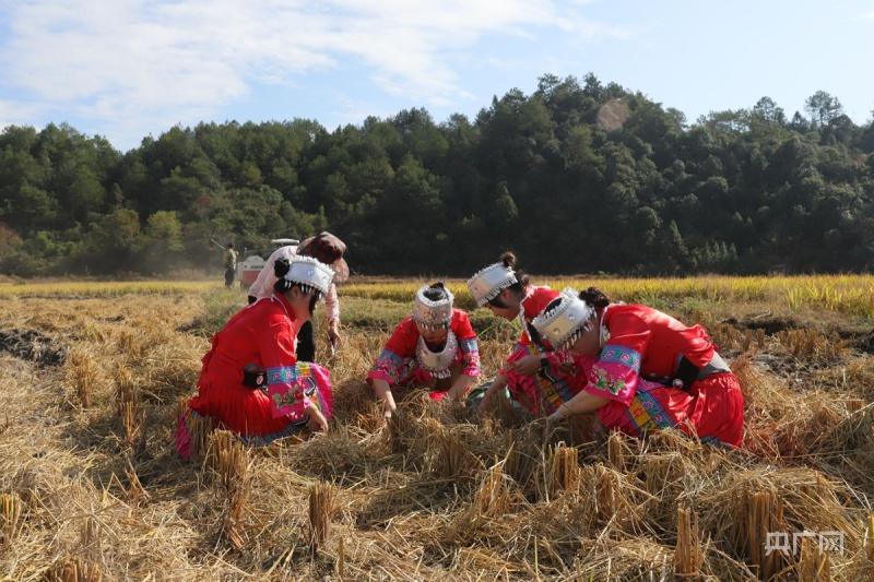 颗粒归仓,畲族姑娘拾稻穗(央广网发 傅贤斌 摄)
