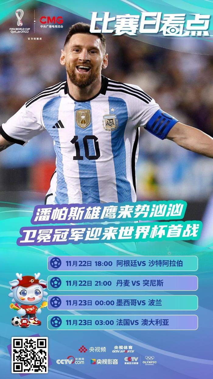 18时,南美劲旅阿根廷队将对阵亚洲球队沙特阿拉伯,梅西将迎来个人第五次世界杯之旅,他能否延续在俱乐部中的出色状态?随后,埃里克森领衔的丹麦队将迎来突尼斯队的挑战。23日0时,莱万多夫斯基将率领波兰队与墨西哥队展开较量;3时,卫冕冠军法国队将迎战澳大利亚队,缺少了本泽马、博格巴和坎特等人的“高卢雄鸡”在首秀上会有怎样的表现,值得期待。