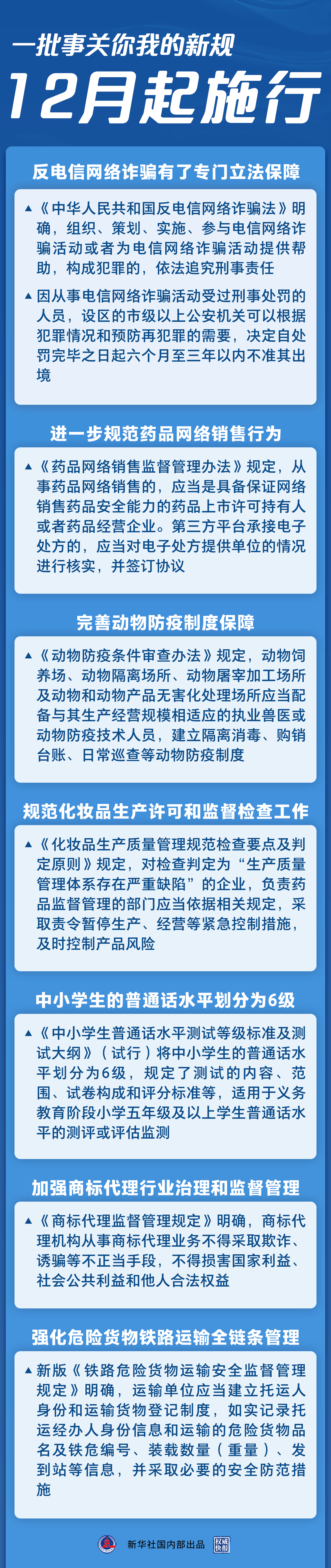 2022年的最后一个月,一批事关你我的新规开始施行。反电信网络诈骗有了专门立法保障,中小学生的普通话水平有了规范标准,药品网络销售平台责任进一步压实……法治,为美好生活助力。