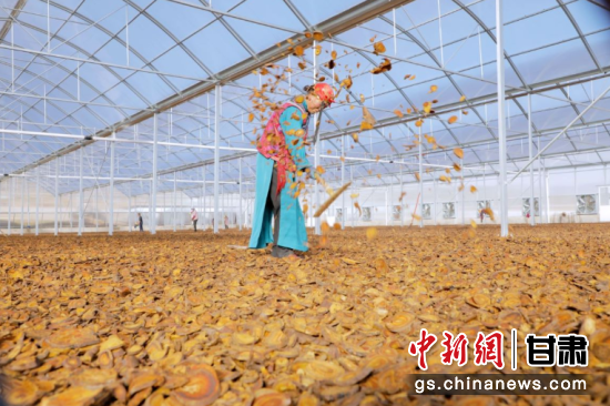 图为12月初,甘南临潭县长川乡生态产业园,大棚里群众忙着晾晒中藏药材。 韦德占 摄