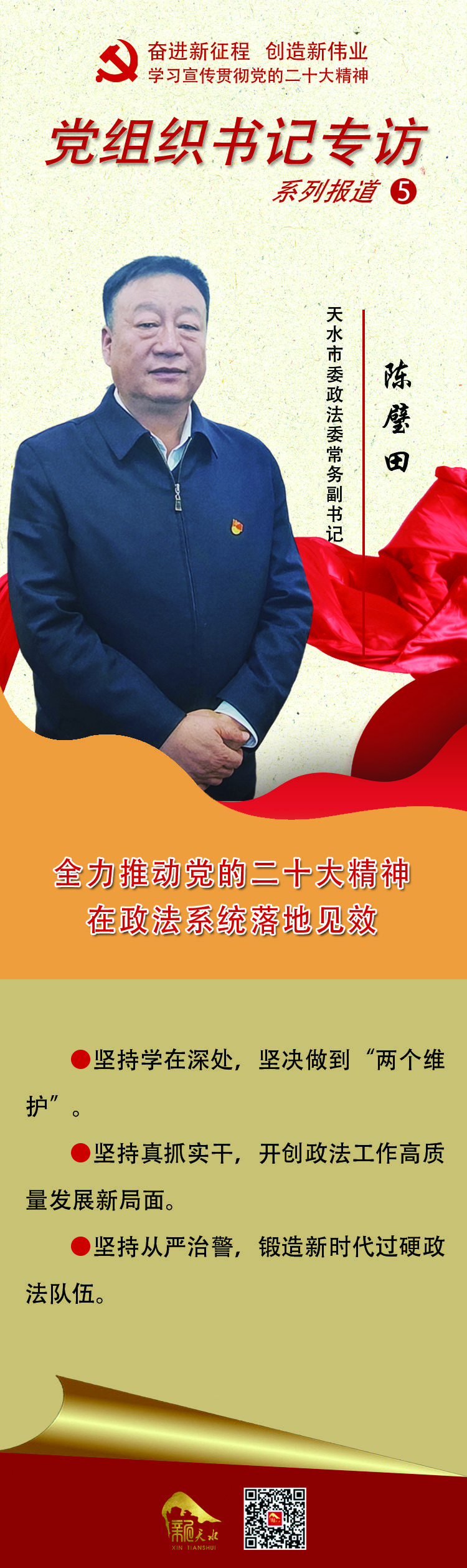 “党的二十大擘画了以中国式现代化推进中华民族伟大复兴的宏伟蓝图,发出了为全面建设社会主义现代化国家、全面推进中华民族伟大复兴而团结奋斗的伟大号召。”日前,市委政法委常务副书记陈璧田接受记者采访时表示,市委政法委机关坚持把学习贯彻党的二十大精神作为当前和今后一个时期的首要政治任务,通过开展“六学六进”活动,不断加深对党的二十大丰富内涵和精神实质的理解把握,着力在维护国家政治安全、确保社会大局稳定、促进社会公平正义、保障人民安居乐业上展现新作为,努力建设更高水平的平安天水、法治天水。