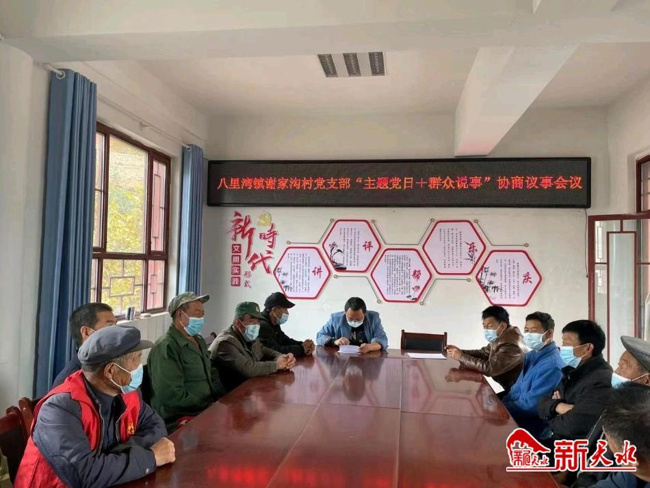 新天水讯 12月3日,甘谷县八里湾镇谢家沟村,一场由村“两委”成员、党员、群众代表、驻村干部参加的“主题党日+群众说事”活动正在开展。