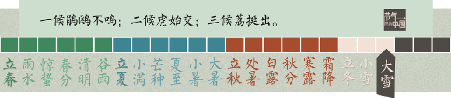 大雪是二十四节气中第21个节气,也是冬季的第三个节气。在此期间,我国北方大部分地区气温都会降到零摄氏度以下,呈现出千里冰封、万里雪飘的场面;随着冷空气不断南下,江南地区气温持续下降,偶尔可见雪花飞舞、漫天银色的景象。