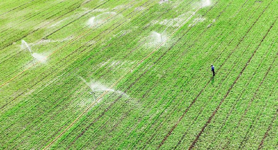 河北省遵化市平安城镇农民开启喷灌机浇小麦封冻水(无人机照片)。新华社发(刘满仓摄)