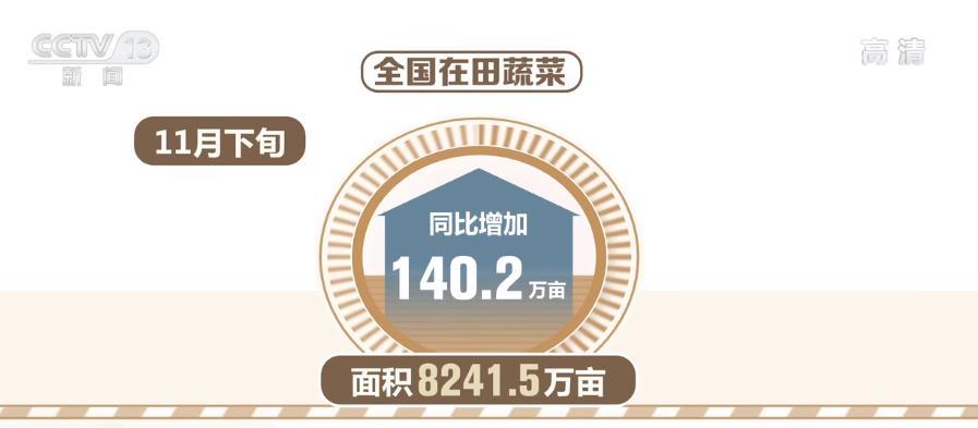 从供应量看,当前,“菜篮子”产品总量充足。全国蔬菜主要品种长势正常,面积产量均有所增加,11月下旬在田蔬菜面积8241.5万亩、同比增加140.2万亩,产量2414.2万吨、同比增加65.3万吨。水果产量处于高位,生猪生产仍在增长。