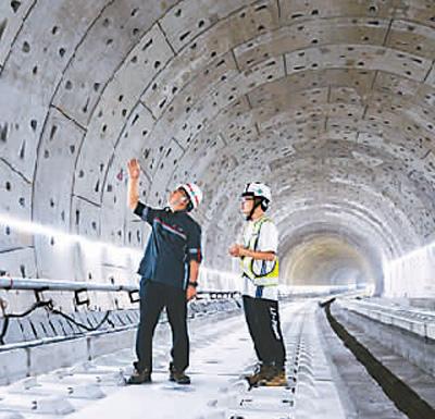 5月9日,印尼中国高速铁路有限公司工作人员在雅万高铁1号隧道内查看施工情况。