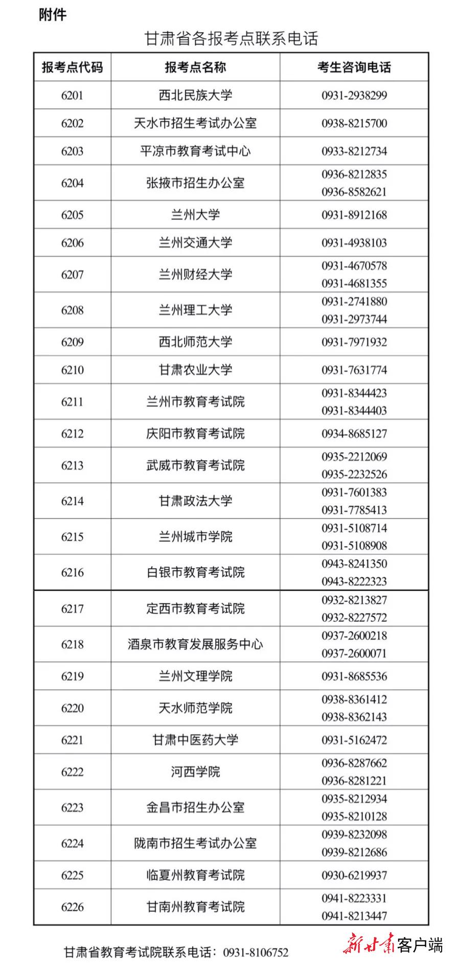 同时,公告还温馨提示各位考生, 要密切关注中国研究生招生信息网、甘肃省教育考试院、各报考点发布的研考公告信息,按要求在最终确认考点参加考试。另外还要务必保持网上报名和确认时填报的手机号码畅通,以便及时接收重要提示信息。如有疑问或遇突发状况,考生可及时与报考点或甘肃省教育考试院联系。