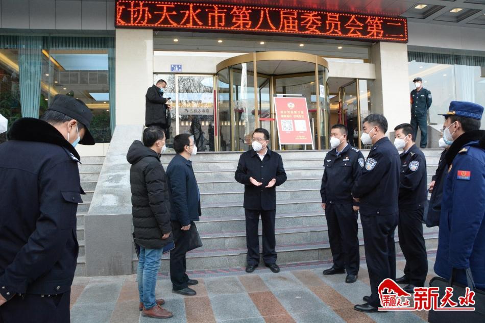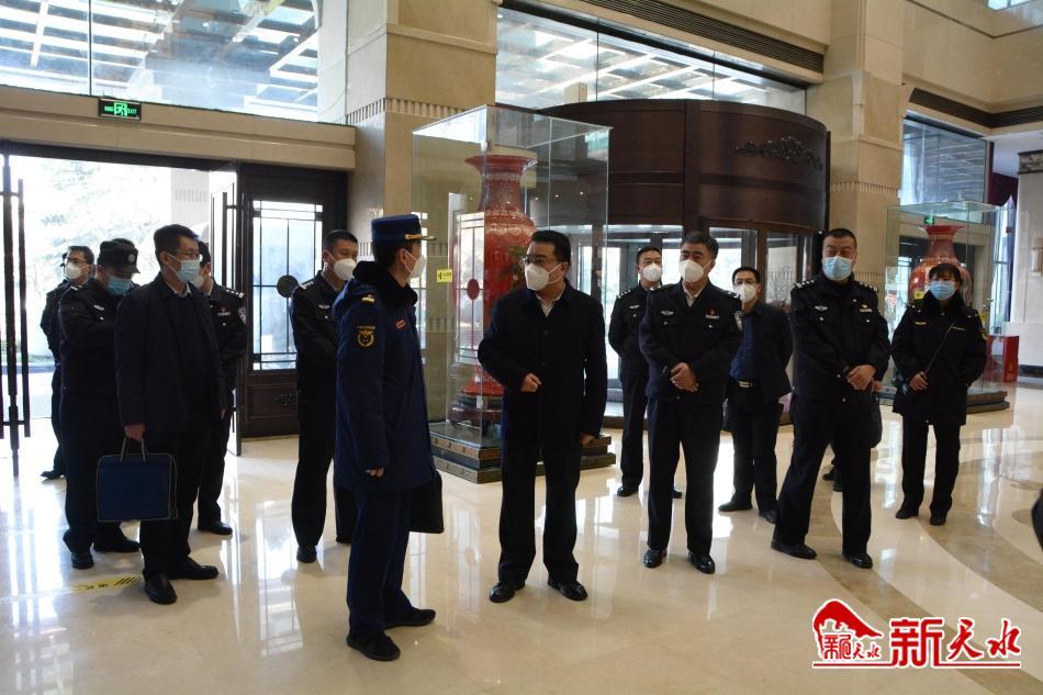 新天水讯【记者童强】12月9日下午,副市长、市公安局局长郭庆祥带领公安、应急、市场监管、消防救援等部门,先后到天水宾馆、天辰大酒店、秦州大剧院检查指导全市两会安保工作。