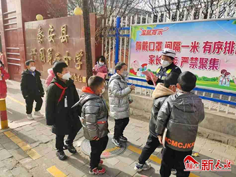 新天水讯【通讯员康瑞萍】12月12日,秦安县公安局交警大队民辅警在秦安县第二小学门口发放“一盔一带”宣传单,进行交通安全宣传,增强广大师生的交通安全意识和文明交通意识。