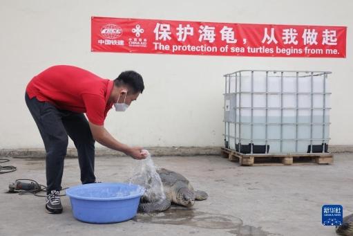 去年以来,参加中国援建项目的工人们多次在项目施工附近区域看到海龟的踪迹。他们发现,当地居民倾倒的生活垃圾阻隔了海龟返回海洋的通道,渔民的捕鱼器具也常将它们误伤,致使海龟受困岸边。于是,工人们将海龟带回项目部悉心照料,确认无伤病后,将他们放归大海。