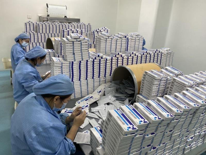 ▲河北东风药业有限公司的工人们正在进行药品外包装工作。(受访单位供图)