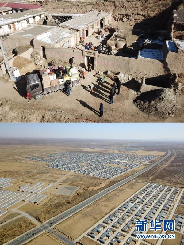 上图为古浪县黄羊川镇石城村原貌。下图为古浪县黄花滩生态移民区。(无人机照片 新华社记者 范培珅 摄)