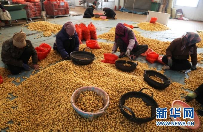 在定西市安定区香泉镇马铃薯产业园内,工人在筛选马铃薯原原种。(新华社发)