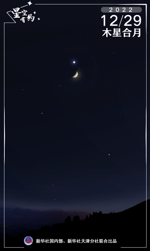新华社天津12月27日电(记者周润健)天文科普专家介绍,12月29日晚天宇将上演木星合月,这是2022年最后一场行星合月。届时只要天气晴好,我国公众可在南方天空欣赏到明亮木星与一轮上弦月近距离竞辉的唯美画面。