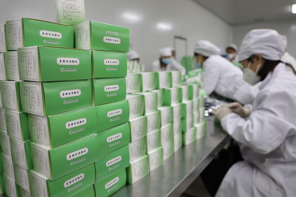 在甘肃兰药药业有限公司生产车间,工人们正在打包宣肺化浊颗粒。新华社记者 多蕾 摄