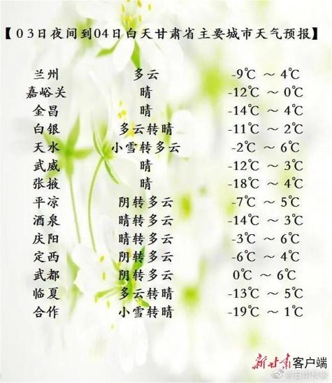 1月3日夜间到1月4日白天,定西、陇南、天水、平凉等市多云间阴,部分地方有小雪;甘南、临夏两州多云,局部地方阴有小雪;省内其余地方多云或晴。
