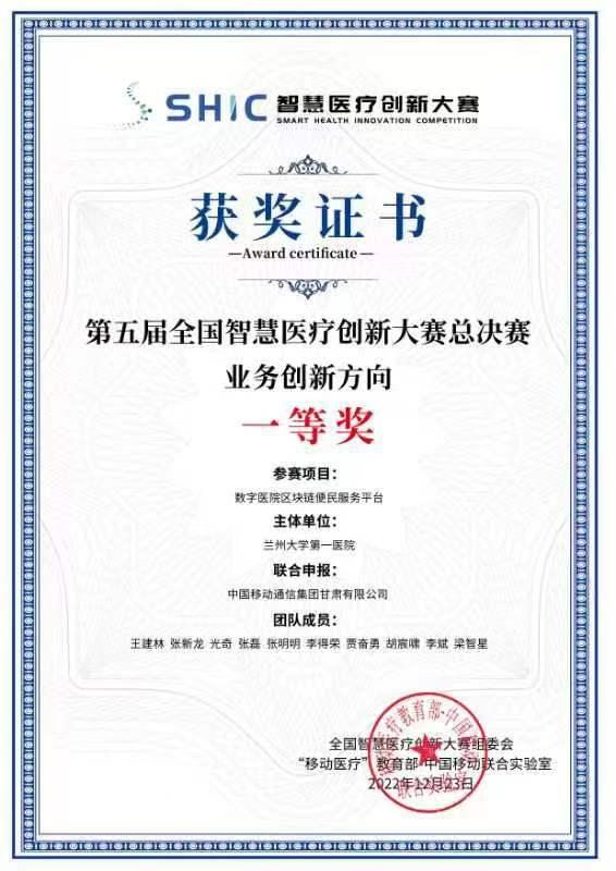 近日,在“第五届全国智慧医疗创新大赛总决赛暨首届全国医疗信息创新大会”中,甘肃移动联合兰州大学第一医院申报的“数字医院区块链便民服务平台”项目获得大赛业务创新方向一等奖,创造性建设了省内首个区块链在医疗数据可信共享领域的实际应用。