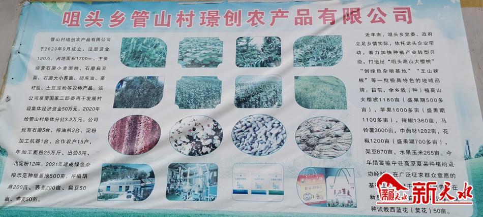 咀头乡管山村璟创农产品有限公司于2020年9月成立,注册资金120万元,占地面积1700平方米,主要经营石磨小麦面粉、石磨扁豆面、石磨小荞面,胡麻油、菜籽油、土豆淀粉等农特产品。公司采用“党支部+公司+农户+基地”模式,2020年给管山村集体分红3.8万元,2021年和2022年给管山村集体分红各4万元。公司年加工面粉25万斤、出油8吨、出淀粉12吨。2022年建成绿色杂粮示范种植基地500亩,种植胡麻200亩、荞麦200亩、扁豆50亩、燕麦50亩。