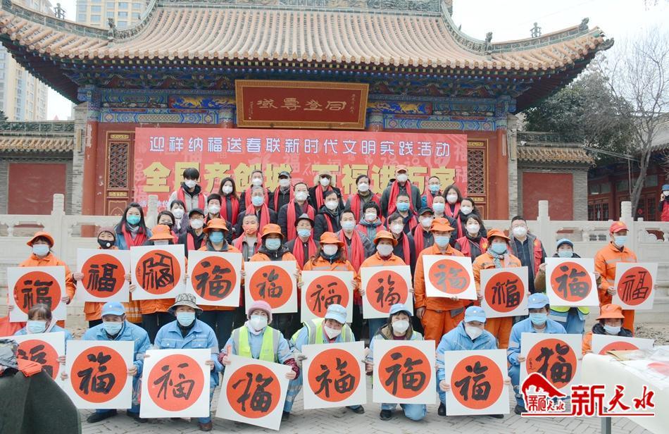 新天水讯【记者童强】新春将至,年味渐浓。1月10日,由天水市美术馆、秦州区城乡环卫治理中心、秦州区东关街道忠武巷社区共同举办的“全民齐创城、万福进万家”迎祥纳福送春联新时代文明实践活动在万寿宫举行。活动组织我市20余名书法家,现场挥毫泼墨、以笔传情,用写满祝福的春联和福字表达对“城市美容师”的致敬与问候。