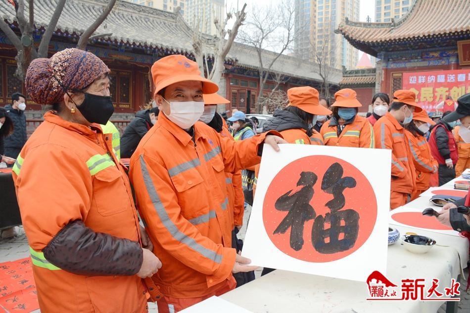 活动中,书法家们现场送出200余副春联和100多个福字,为城市环境卫生整洁辛苦劳作的环卫工人提前送去节日祝福,将对环卫工人的赞美和美好祝愿化作一张张寓意吉祥的“福”字当中,赞颂环卫工人“创造优美环境,建设和谐社会”的良好精神风貌。