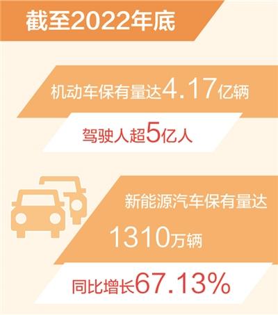 人民日报北京1月11日电 (记者张天培)公安部11日发布统计显示,2022年全国机动车保有量达4.17亿辆,其中汽车3.19亿辆;全国机动车驾驶人达5.02亿人,其中汽车驾驶人4.64亿人。2022年全国新注册登记机动车3478万辆,新领证驾驶人2923万人。
