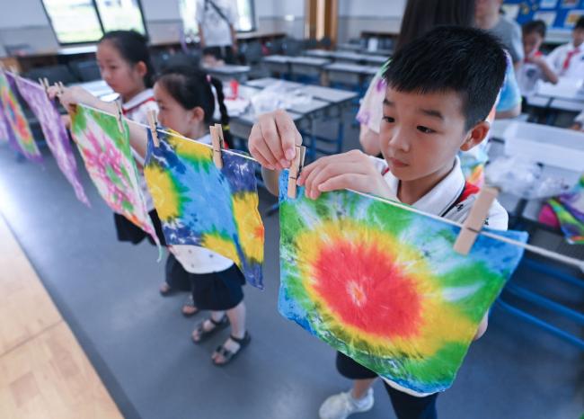 ▲2022年8月10日,湖州市吴兴实验小学的学生把做好的扎染作品挂在教室里。新华社记者徐昱摄