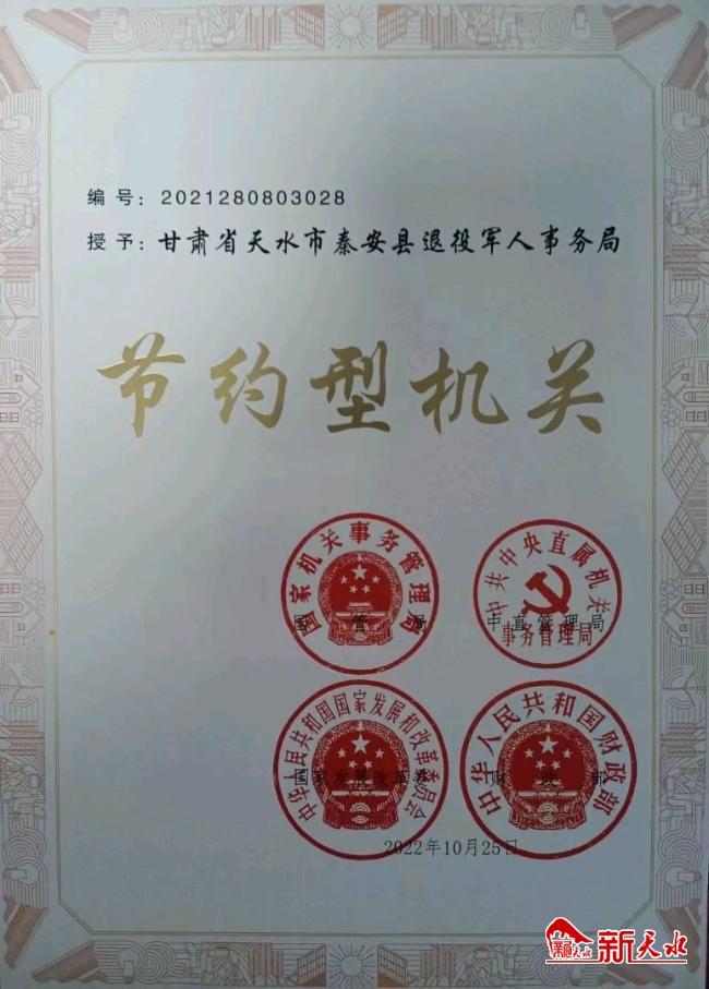 秦安县退役军人事务局荣获国家级“节约型机关”称号