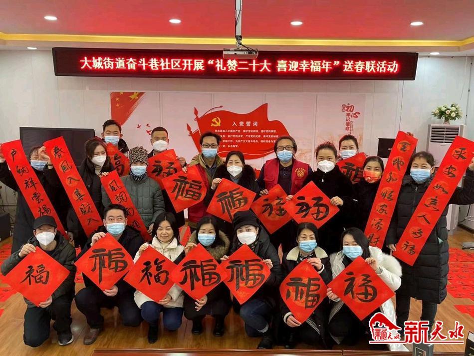 共驻共建送“福”。1月13日上午,区文联在大城街道奋斗巷社区开展“礼赞二十大·喜迎幸福年”送福送春联活动。书法家们挥毫泼墨,一副副充满祝福和对美好生活向往的大红对联跃然纸上,整个现场墨香四溢,充满了文化韵味。通过开展送福送春联活动,既为群众送上了新春祝福,也发挥了文联的行业优势,促进了“共驻共建”深入开展。