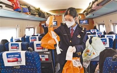 1月19日,G321次列车上,工作人员正在为旅客派送高铁外卖。
