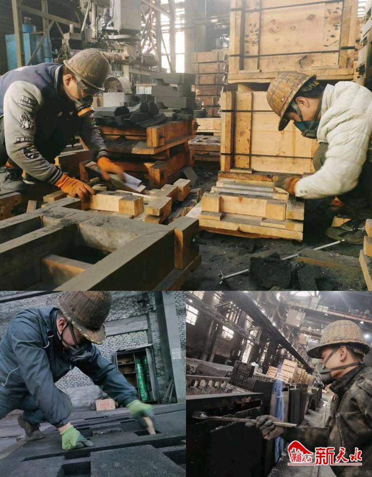 在铸造公司,师傅们佩戴防护口罩,为赶制砂芯而争分夺秒。有造型的,有填砂的,有刷涂料的………忙得不亦乐乎。