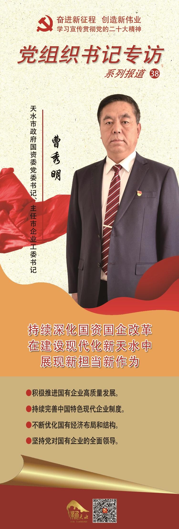 “党的二十大报告指出,要深化国资国企改革,加快国有经济布局优化和结构调整,推动国有资本和国有企业做强做优做大,提升企业核心竞争力,这为新时代国资国企改革发展指明了方向。我们将把学习宣传贯彻党的二十大精神作为当前和今后一个时期的首要政治任务,紧密结合省第十四次党代会和市第八次党代会精神,在补短板、强弱项、固底板、扬优势上下功夫,努力谋划和推动国资国企发展改革监管和党的建设各项工作取得新成效,在天水推进中国式现代化中展现国资国企新担当新作为。”日前,市政府国资委党委书记、主任,市企业工委书记曹秀明在接受记者采访时说。