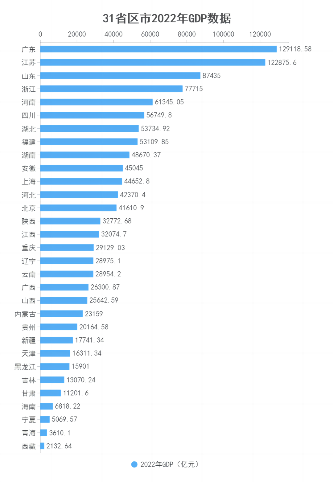 2022年中国经济版图迎来新变化。目前,31个省区市2022年GDP数据已经公布,广东、江苏GDP超12万亿元,江苏紧追广东,两者GDP差距继续缩小。安徽超越上海,跻身GDP前十强。甘肃GDP增速全国第三。