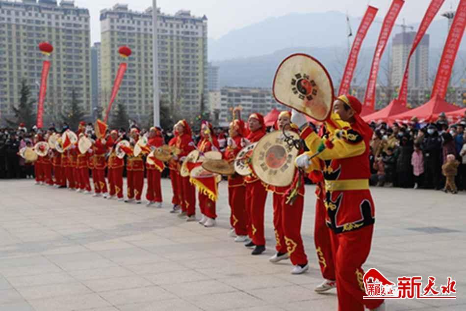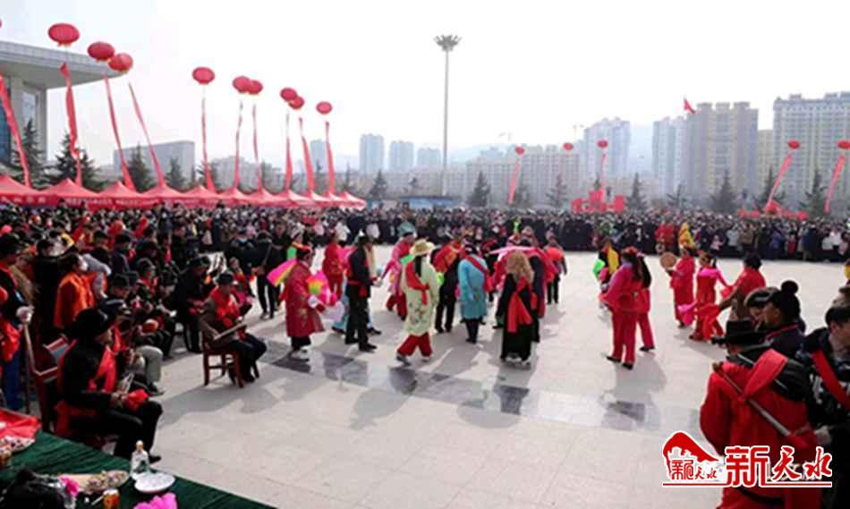 新天水讯 热闹的秧歌扭起来,欢快的高跷踩起来。2月2日,正月十二,来自武山县滩歌镇卢坪村的旋鼓舞、高跷、马排子等秧歌一路欢歌而来,汇聚武山人民广场进行民俗文化展演。
