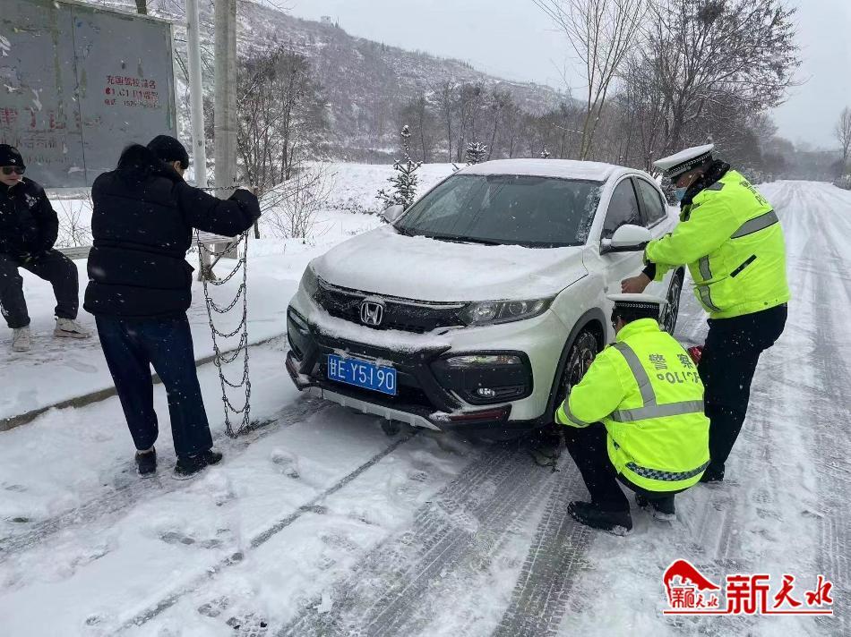 2月13日上午,一辆小轿车受困在省道221线张家川段桥沟梁。现场路面结冰,通行条件非常差,张家川公安交警接到求助后,立即帮助驾驶员安装防滑链,并现场指挥引导其他车辆加装防滑链。同时,通过微博、微信向群众推送天气信息,发布路况信息及交通管制状况,引导广大交通参与者合理选择出行时间和行驶路线,提前做好安全防范工作,确保出行安全。