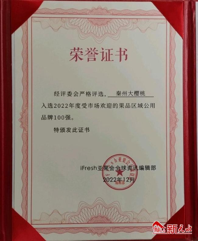 新天水讯【通讯员 赵雅琪】日前,在由iFresh亚果会联合10家行业媒体共同发起的“2022年度受市场欢迎的果品区域公用品牌100强”网络票选活动中,“秦州大樱桃”品牌在全国300家果品区域公用品牌当中脱颖而出,以樱桃区域品牌网络投票第一的优势,经有关专家进行综合评定,入选“2022年度受市场欢迎的果品区域公用品牌100强”。