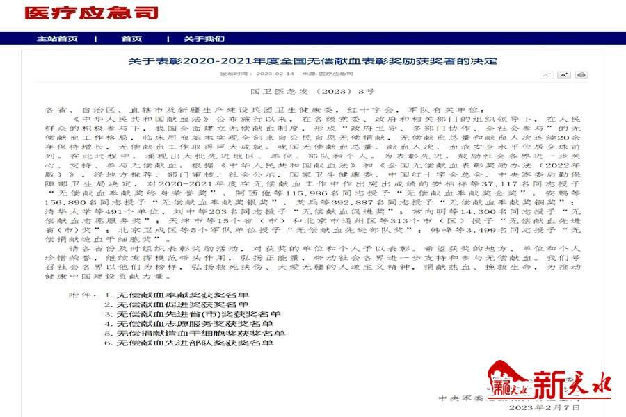 新天水讯【通讯员 赵雅琪】近日,国家卫生健康委、中国红十字会总会、中央军委后勤保障部卫生局联合印发《关于表彰2020-2021年度全国无偿献血表彰奖励获奖者的决定》,天水市再次获得全国“无偿献血先进市”称号,这是我市连续第7次获此殊荣。
