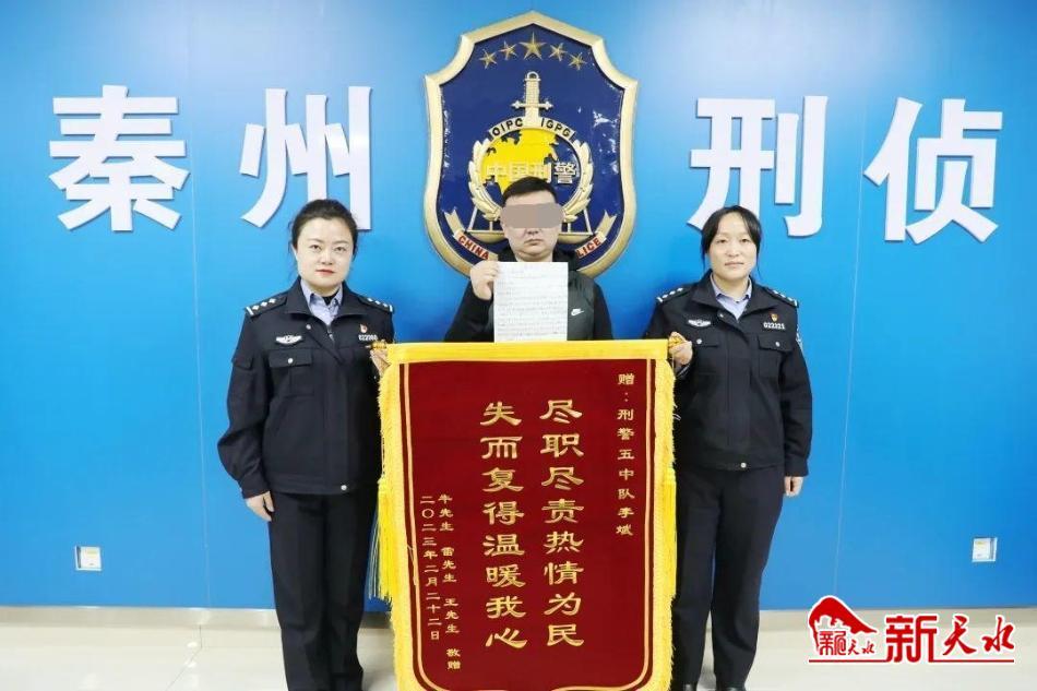 新天水讯【记者蔚军平】3月1日,秦州区的牛先生来到秦州公安分局刑侦大队五中队,将一面写有“尽职尽责热情为民、失而复得温暖我心”的锦旗递到了民警手中,对民警帮助自己追回20余万元的被骗钱款表示感谢。