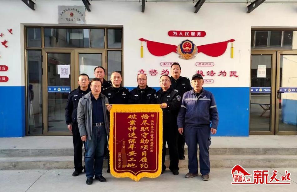 新天水讯【记者蔚军平】2月28日,某施工项目部相关负责人来到清水县公安局红堡派出所,将一面写有“恪尽职守助项目履约、 破案神速保平安工地”的锦旗赠送给了民警,对民警成功破案及时追回资金给予高度赞扬。