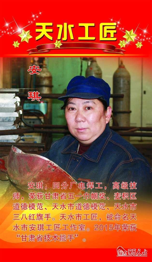 安琪是天水锻压集团的一名女电焊工,参加工作她就选择了电焊工种,一干就是28年。28年来,她始终坚持“条条焊缝、表里如一”的理念,创造了不凡的业绩,为企业的高质量发展作出了巨大贡献。多年来,被授予“三八红旗手”“天水锻压劳模”“天水工匠”“天水市三八红旗手”“甘肃省三八红旗手”“甘肃省五一巾帼奖”“甘肃省技术能手”“甘肃省劳动模范”。(任号杰)